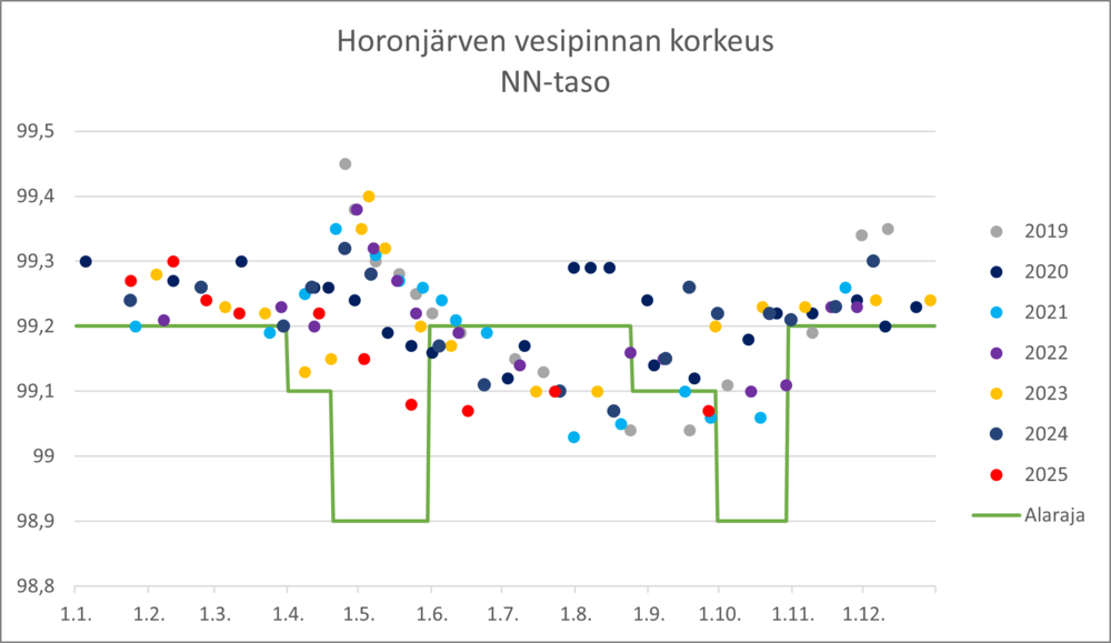 Horonjärvi ja Lääminki ovat säännösteltyjä järviä, joiden vesipintojen korkeuksia säännöstellään lankkupatojen avulla. Säännöstelyluvan omistaa ja patojen juoksutuksia säätelee paikallisista maanomistajista koostuva yhteisö Horon- ja Lääminginjärven järjestely-yhtiö. Säännöstelyluvan ehdot määrittävät kummallekin järvelle vedenpinnan alimman sallitun korkeuden. Horonjärvellä vedenpintaa sallitaan alennettavan keväisin ja syksyisin. Läämingillä vedenpinta pyritään pitämään vakiona ympäri vuoden. Kuvaajista voidaan havaita, että kuivina kesinä vesipinnan korkeus jää lupaehtojen salliman alarajan alapuolelle. Sinä aikana, kun mittaustuloksia on kerätty (2019-2025), Horonjärven pinnan korkeus on jäänyt heinäkuun aikana aina alemmaksi kuin lupaehdot sallisivat.