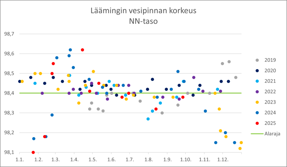 Kuvaajat on päivitetty viimeksi 30.9.2025. Läämingin kuvaajassa näkyy järven pinnan tilapäinen laskeminen alarajan alapuolelle talvien 2023-2024 ja 2024-2025 aikana.